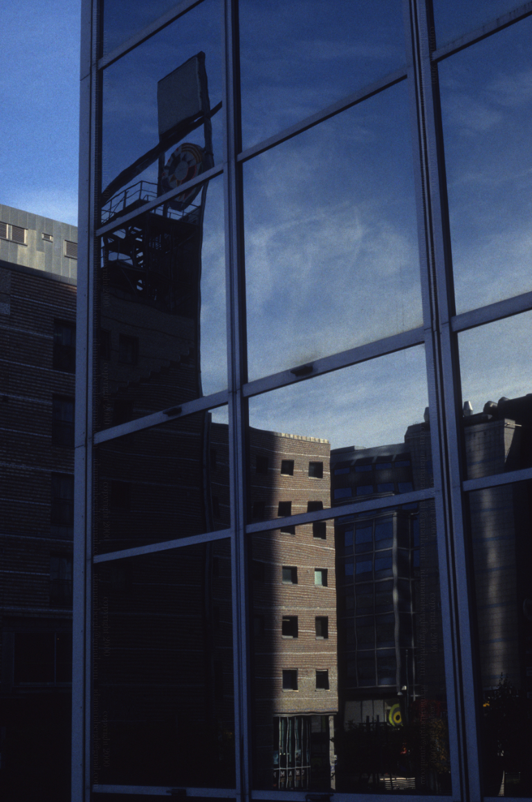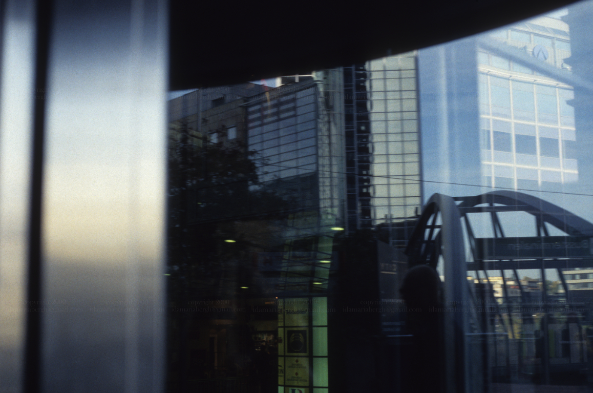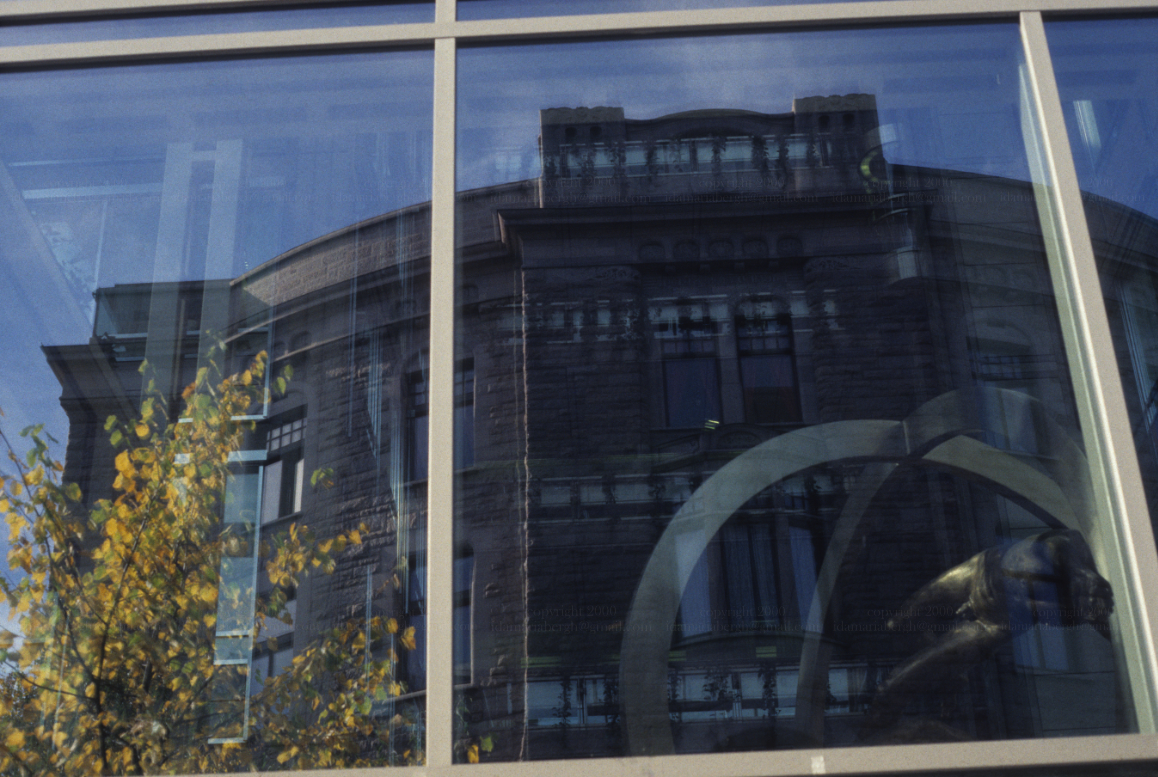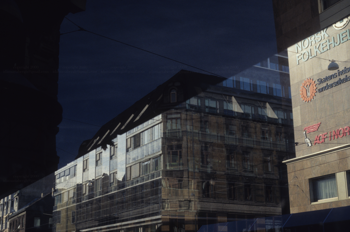 Five photos from the photographic series The Mirrored City from 2000 are shown here above. I photographed them using a 200 iso Fujichrome color slide film in my analog SLR camera with a 50mm lens. My camera setting were: manual focus with aperture and exposure time set to auto. The Mirrored City I, II, VI, VII were digitalized in 2022 and The Mirrored City III in 2023.