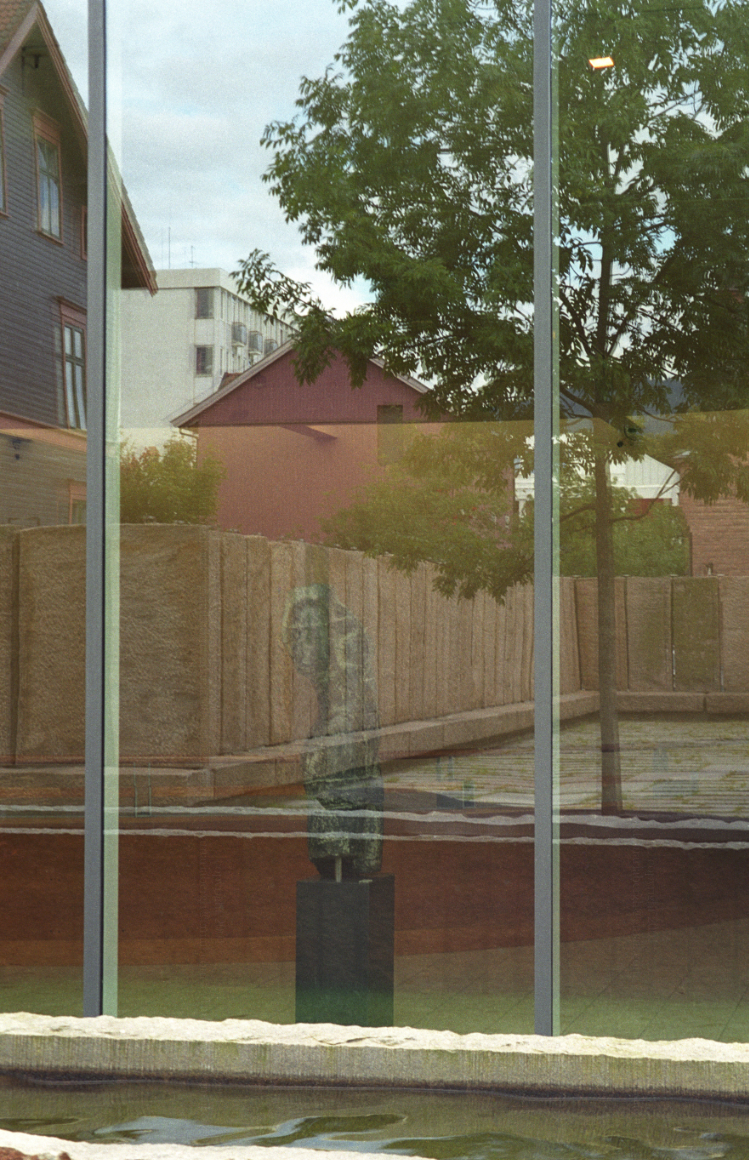 The three photos, shown here above, are titled Mirror image III, The mirrored town and Mirrored image IV and they are from 2001. One was photographed using a 200 iso Preus color negative film and the other two using a color negative 200 iso FUJIFILM. In the photo Mirror image III you can se me with the analog SLR camera and its 50mm lens that they were all photographed with. My camera setting were: manual focus with aperture and exposure time set to auto. Digitized in 2022.